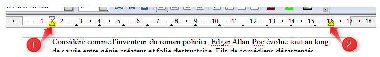 Sur la règle horizontale, la partie dans les marges est grisée, la numérotation sur la règle commence après la marge gauche.