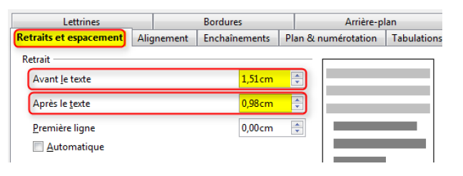 Dans le menu Format/Paragraphe, onglet Retraits et Espacements, on trouve les valeurs précises en cm avant et après le texte :