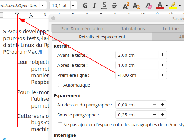 Le retrait de première ligne négatif a un effet inverse, la première ligne commence avant le reste du paragraphe.