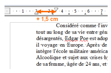 Le retrait vient s'ajouter au retrait avant le texte, dans l'exemple ci-dessous il est de 1,5 cm soit une première ligne à 3,5 cm de la marge :