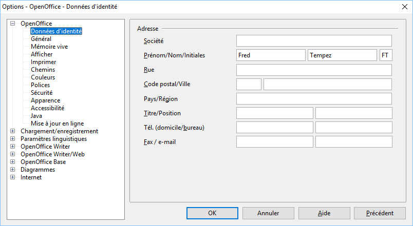 Avant d'utiliser le mode révision, les données d'identités doivent être correctement saisies, les vérifier dans le menu Outils / Options /OpenOffice / Données d'identités :