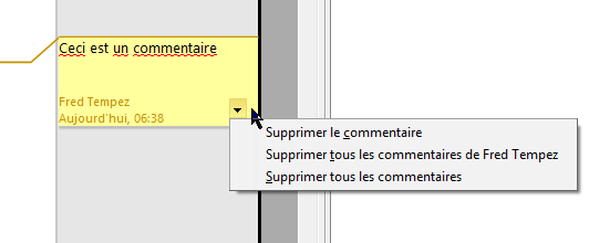 - Les commentaires : ce sont des vignettes "post-it" qui s'affichent au-delà de la marge droite et qui permettent aux rédacteurs de commenter des passages du document.