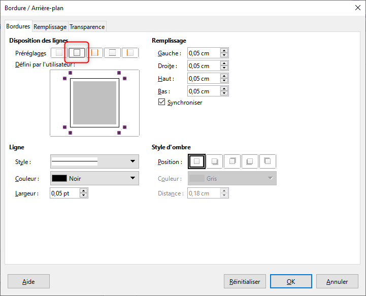 En bas de la fenêtre, cliquez le bouton Plus et appliquez un encadrement en utilisant ce préréglage :