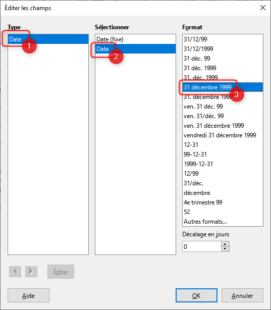 Dans votre document, modifiez le format de la date comme sur l'écran précédent (date non fixe et format long).