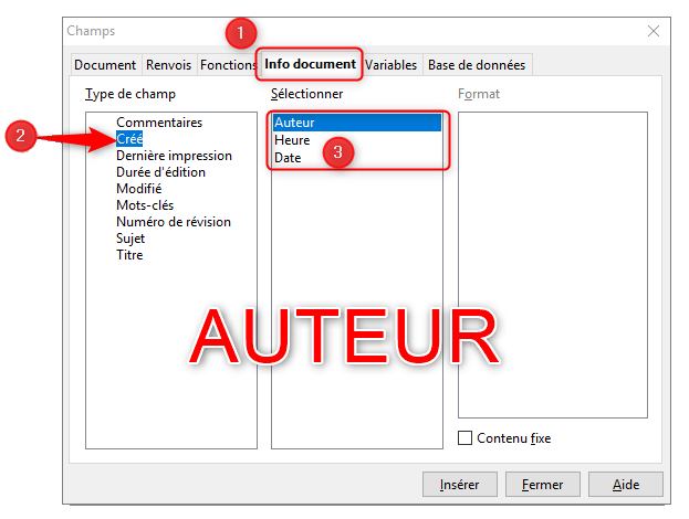 Dans l'onglet Info Document (1), cliquer sur Créé (2), puis la date ou l'heure de création. On peut également insérer le champ Auteur qui est le même que Premier Auteur.