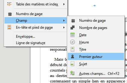 Pour insérer le nom du premier auteur il suffit de le sélectionner dans le menu Insertion :