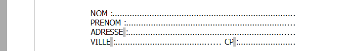 - Pour la quatrième ligne, il faut ajouter un taquet supplémentaire pour atteindre l'emplacement pour le Code Postal. Ajoutez une nouvelle tabulation à 10 cm, alignement à gauche, le caractère de remplissage est identique. Validez.