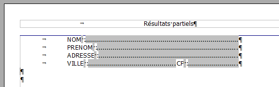 - le point d'insertion (curseur) étant au début de la quatrième ligne, Tabulation et tapez VILLE :