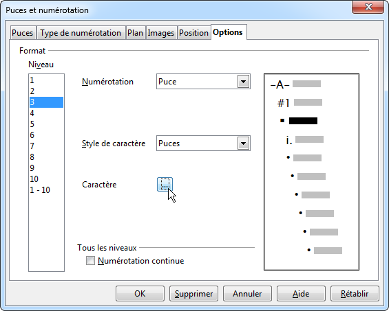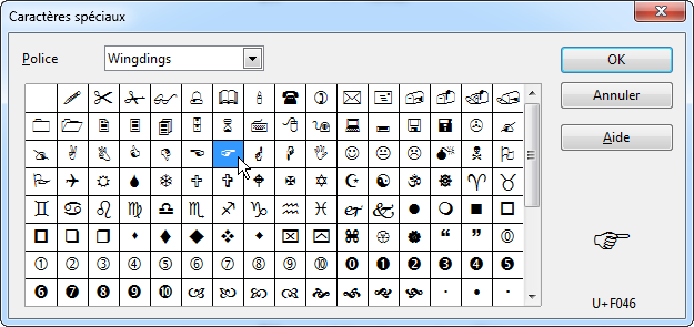 Cliquez sur le bouton à droite de caractère et sélectionnez la police Wingdings puis ce symbole. Validez les écrans :