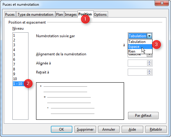 - Cliquez dans la liste et dans le menu Puces et numérotations, dans l'onglet Position