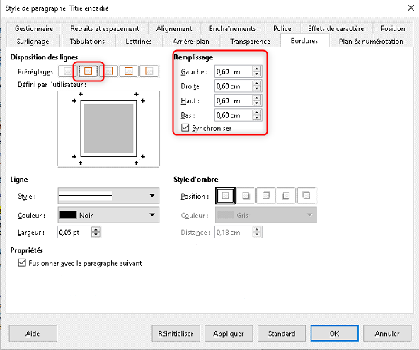 Exemple de paramétrage de la bordure, attention à bien saisir 0,6 cm et non 0,06cm :