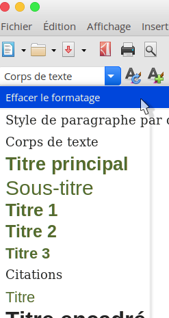 Attention, la commande Effacer le formatage du sélecteur de style de la barre d'outils supprime les styles appliqués dans la sélection.