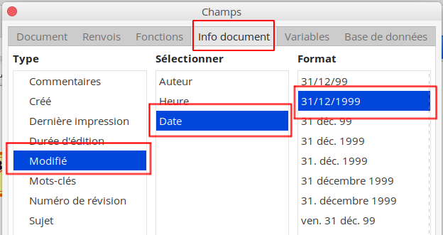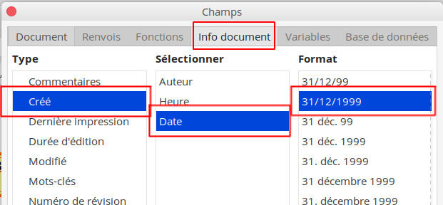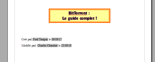 En page de garde, insérez le champ auteur et la date de création, le champ éditeur et la date d'édition dans le bon format.