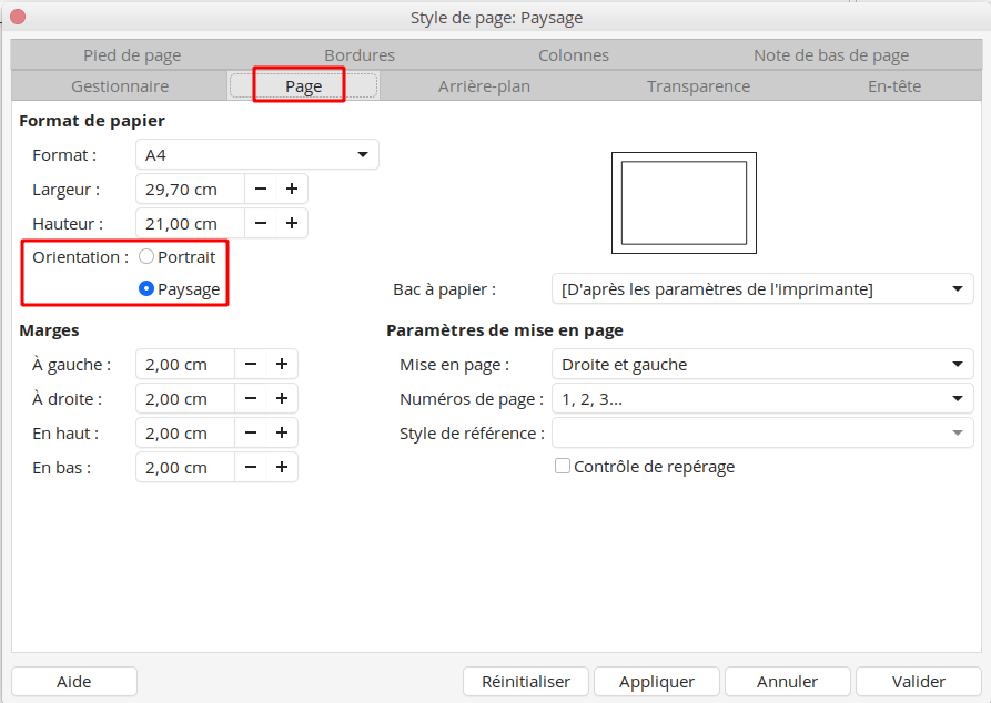 Ce paramètre est confirmé dans le cadre orientation de l'onglet Page :