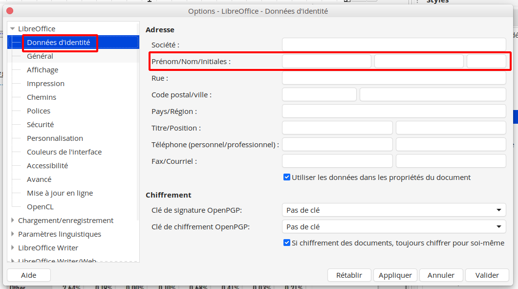 Renseignez cet écran au minimum avec VOTRE prénom et VOTRE nom, validez puis enregistrez le document.